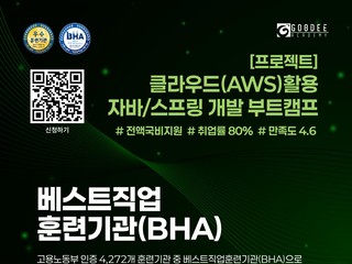 [무료교육] 구디 자바 개발자 취업연계 과정 – 실무+프로젝트+멘토링 한 번에! (~12/08) ■ 지원자격① 국민내일배움카드 발급이 가능한 자② 학력무관(단, 비전공자...